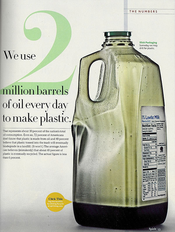 Click the image to see it larger and read the text. I’m not sure what to make of this. As I said, I saw a lot of plastic on my Southwest flight, and I saw it being collected in plastic bags. I’ve sent a letter to the company via snail mail inquiring into their environmental practices. Does this one page in their magazine reflect the company’s thinking on environmental issues or simply those of one magazine contributor? We’ll find out…