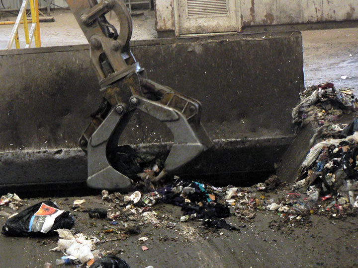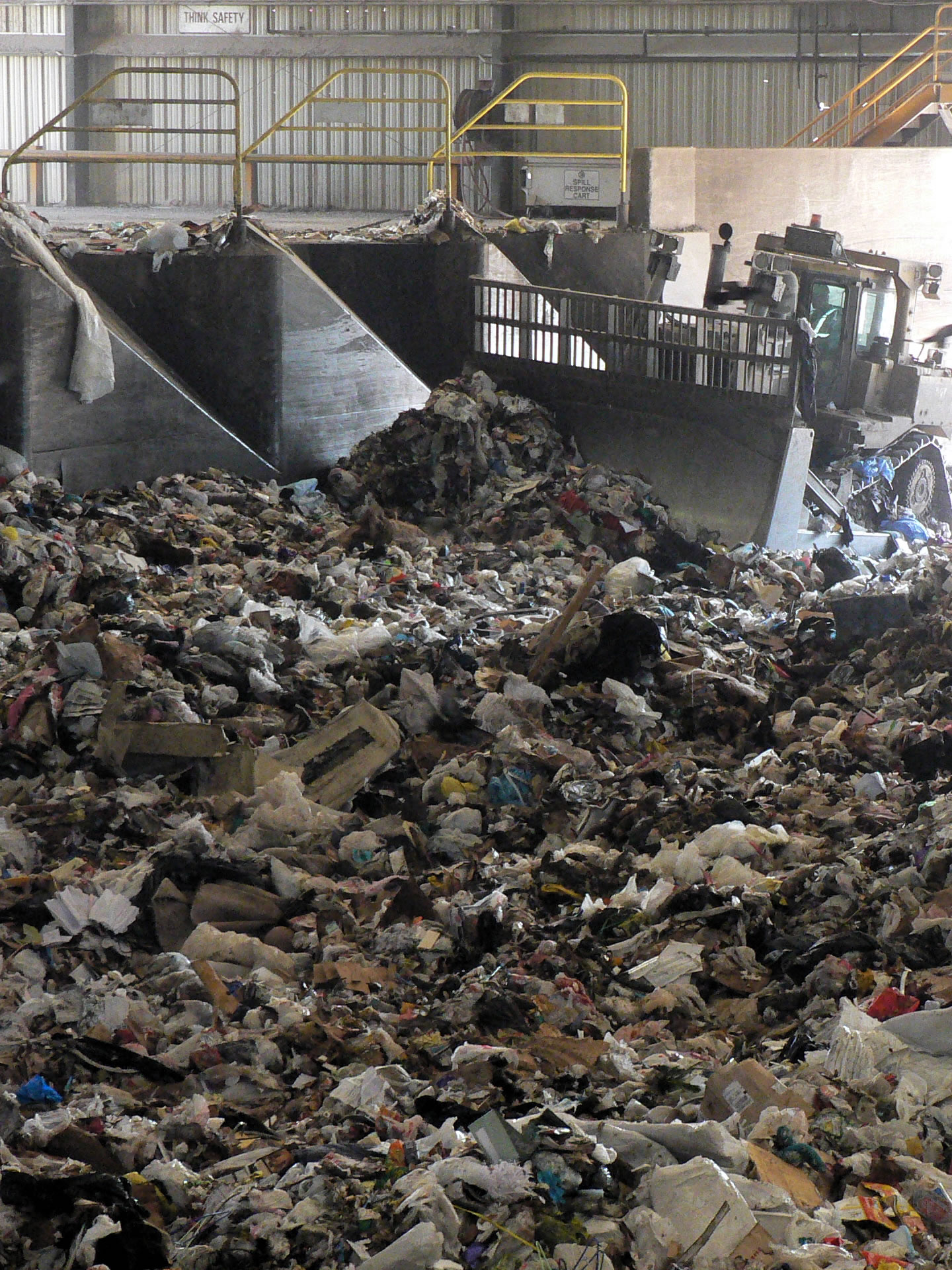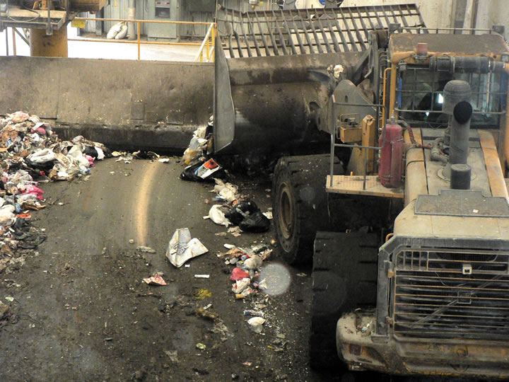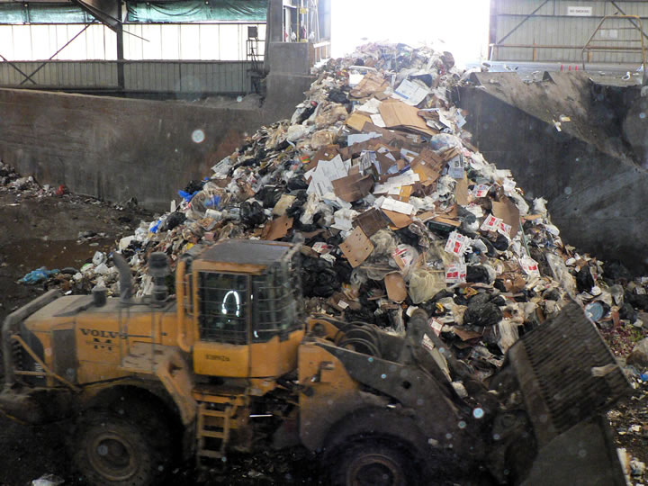 My tour of Davis Street Transfer Center continued with a trip to the garbage transfer pit. This is where all of Oakland’s non-recycled garbage is dumped before being transferred in huge trucks to the Altamont Landfill. Just look at it all. You may not be able to tell from the photo how much recyclable material is mixed in with the garbage, but I can assure you that it’s a lot.