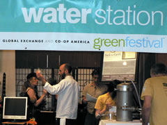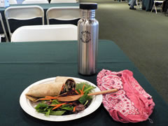 Anyway, after walking a couple of miles to the festival from the wharf, I was starving and headed directly for the food court, where I was happy to see that all the offerings were organic, the tableware was compostable, and the water was piped into a water station rather than served in plastic bottles. I had a tasty veggie wrap and salad from Back to Earth Organic Caterers and filled up my own Klean Kanteen at the water station. Instead of taking their disposable napkins and compostable cutlery, I used my own cloth napkin and To-Go-Ware utensils.