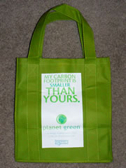 So that was plastic surprise #1. I didn’t notice plastic surprise #2 until I got home and emptied out my goodie bag and noticed a terrible smell. In fact, this smell is not unlike that of San Francisco Bay earlier in the day. It came from the Discovery Channel’s Planet Green reusable tote bag, which I’d been planning to give away. But I can’t subject anyone to the plastic fumes from this bag, besides the folks who brought it into the world to begin with. So I’ll be sending it back to the Discovery Channel with a nice little note. Funny, the bag says, “My Carbon Footprint Is Smaller Than Yours.” Somehow, I doubt it.