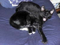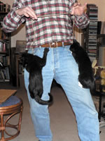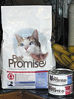 So you’re probably wondering what we were eating. Salmon. Ocean fish. Chicken. Yummy stuff. It’s all Pet Promise Brand cat food. Â (2011 Update: Sadly, the Pet Promise brand was discontinued due to the economic downturn.) We can have dry food all day long and wet food from cans twice a day. When that happens, Soots tries very hard to eat his wet food and Arya’s too. Sometimes Beth pushes him back to his own bowl and sometimes she puts me, Arya, on the counter where Soots can’t bug me. I really do think she likes me best.