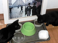 This is our dining room. No plastic here, either. Just a metal tray, some ceramic and glass bowls, and a very nice painting, possibly from the Impressionist Period, of humans with umbrellas that Michael put here for us to enjoy while we eat. We don’t know what umbrellas are because we don’t go outside. And we’re pretty sure it would be fun to scratch, except so far we have been too busy eating while in our dining room to remember to try out the Impressionist scratching post that Michael so considerately provided to us.