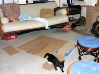 This is our playground, a.k.a. Beth and Michael’s living room. We have lots of cardboard on the floor and blankets and pillows. We like living here because it is soft and we don’t get yelled at for running on the sofa even though we do get yelled at for scratching the carpet. Something about a landlord. We don’t know what that is, but it sounds scary.