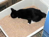 This is what we do after we eat. We have a plastic litter box that Beth says was okay for her to get for us because it came from a nice person on Freecycle, so she didn’t have to buy new plastic. Right now, we are using SwheatScoop natural cat litter. [2016 Update: We are now using Integrity Brand litter instead since Swheatscoop switched to a plastic bag.] It works fine for us, but Beth has been reading many differing opinions and has not decided if this is what we will always use. Also, after we do our business, Beth scoops out the lumps with a spoon and flushes them down the toilet once a day. Now, we know that you are thinking that she is killing sea otters. But she thinks that our poop is sea otter safe because we have never been outside to pick up the dreaded Toxoplasma gondii parasite and we will always be indoor kitties. After she takes us to the vet, she will know for positively sure.