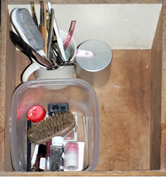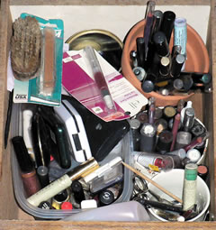 And look at this drawer full of plastic. It’s the makeup drawer in my bathroom. Don’t know how a low maintenance girl ended up with so many pots and trays and tubes and bottles. A few of these things I’ve had since the early 90’s. The only time this drawer gets opened is for Halloween or the occasional 80’s dance party, when even Michael will wear a little eyeliner. (It looks great on him!)