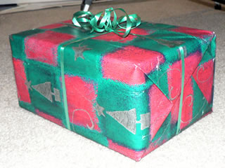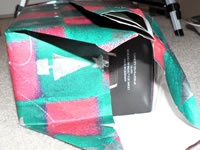 Here are two Christmas presents I received tonight from a company I work for, each containing at least 4 pieces of Scotch (plastic) tape. One thing my friends and family know about me is that I can’t wait to open presents, and tonight was no exception. So I justified my impatience by resolving to figure out a way to re-wrap the same presents using no tape or glue at all.