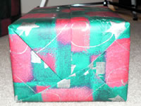 For a few weeks now, I’ve been searching the web for instructions, hoping to find a way to wrap gifts without any tape OR ribbon. I even went to Borders after work tonight to look for a book on gift-wrapping, to no avail. The couple of books I found required double-sided tape. So I decided I’d just have to figure it out myself. I got part of the way there. The method I discovered does require some ribbon to hold it in place, but nothing sticky.