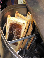 The hives are wooden frames with beeswax starter cells. The bees fill the cells with honey and, as each cell fills up, cap them with their own beeswax. When the hives are full of honey and ready to harvest, the beeswax caps are removed from both sides of the frame with an electric heated knife. This was the first part of our demonstration. The hives had already been gathered into the barn prior to our arrival and the bees sent on to create new hives.