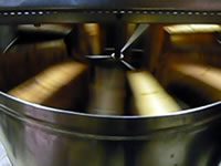 Next the frames are placed into a centrifuge, where they will be spun to extract the honey. The honey flies out from the combs onto the sides of the centrifuge and then runs down the walls and out a spigot into a waiting bucket.