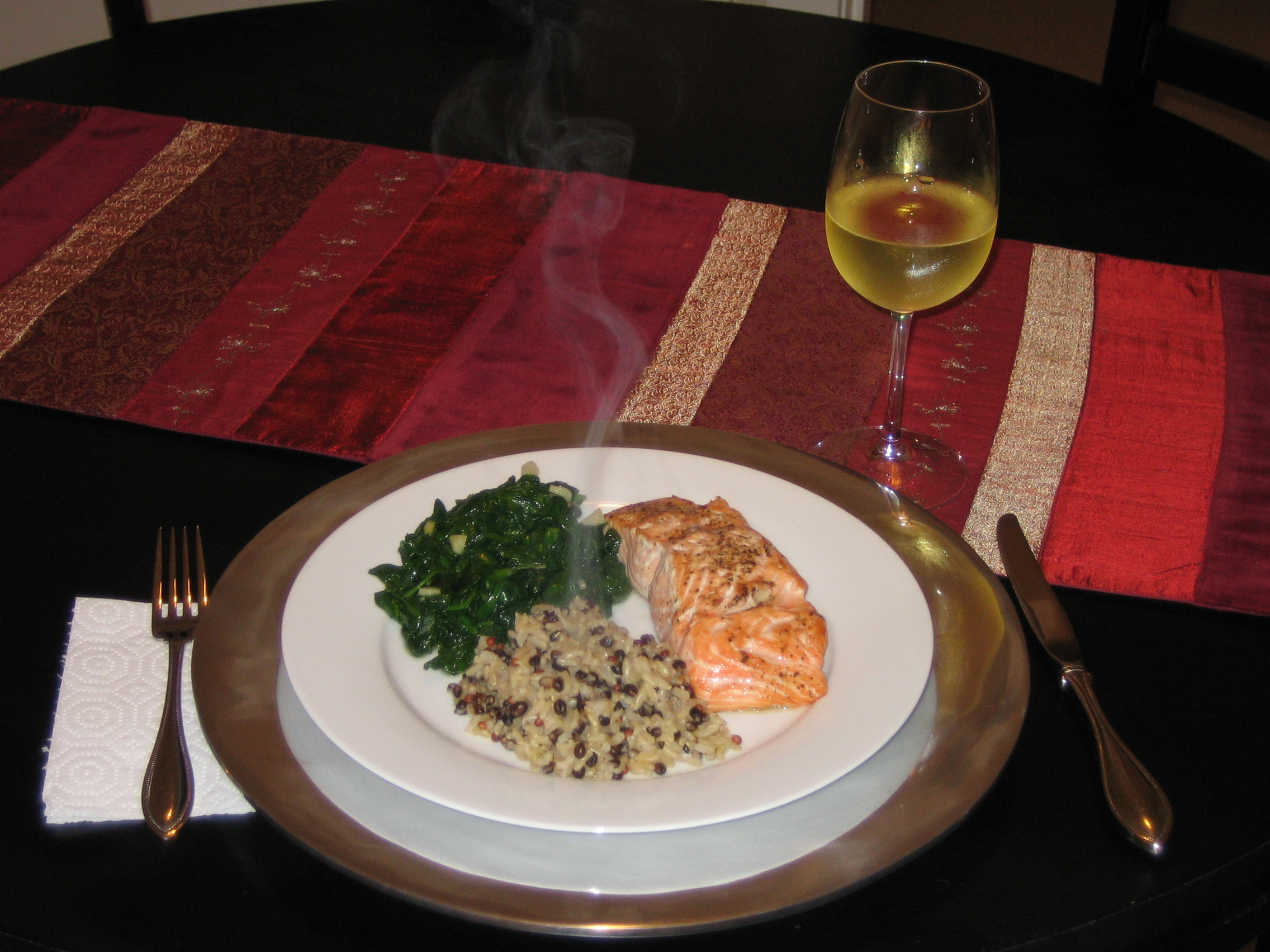 Guest Recipe – Tanya’s Steamed Salmon with Wild Rice and Sautéed Spinach