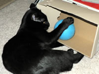 I spin wool and other fibers (including cat hair *s*) into yarns that I use to knit with. I take scraps of wool and felt them into balls and the cats go NUTS for them. They can still smell sheep on the wool… I made one tennis-ball sized ball for another cat nearly ten years ago. It’s eroded a bit but my current 11 month old kitten LOVES that ball. When I spin on the drop spindle, she goes crazy, chasing the twirling spindle.