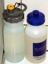 My routine so far (if you can call it that because I just started this experiment this past Sunday) is to use a premixed solution of baking soda and water (2 Tbsp baking soda mixed with 2 cups water in a sports bottle) and a premixed solution of apple cider vinegar and water (same proportions as the baking soda solution.) It’s a good use for the unused plastic sports bottles we had stashed in the cupboard once we switched to stainless steel Klean Kanteens for drinking. (Jeanne uses a glass pitcher, but we tend to be a little too spazzy to keep glass in the bathroom.)
