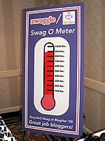 As I mentioned in a previous pre-Blogher post, the conference organizers had the brilliant idea of setting up a recycling room for all the unwanted plastic and other swag attendees didn’t want to take home. At the end of the day on Saturday, the Zwaggle recycling room had collected over 900 pounds of the stuff! The Zwaggle crew said they hoped most of it would be picked up by the vendors to reuse. I hope these vendors will also use the information they gain from picking up all their crap and come up with some truly useful schwag (or swag… there are disagreements all over the Net about the correct term) next time. Who really needs a Michelin Man key chain?