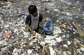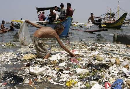 Reuters: Boys collects plastic materials as boats dock near a polluted coastline in Manila April 9, 2008.
