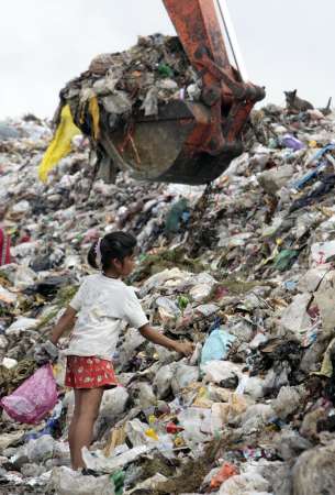 Reuters: A girl searches for plastic waste at a garbage dump site in Thailand’s Ayutthaya province, about 80 km (50 miles) north of Bangkok, May 1, 2007.