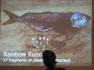 On the Junk’s summer voyage to Hawaii, 1/3 of 500 lantern fish sampled had plastic pieces in their bodies, averaging about 13/specimen. The record holder had 84 pieces. The lantern fish is prey for swordfish, salmon, and tuna, meaning that plastics are getting into our food supply. In total, over 267 marine animal species have been documented ingesting or getting entangled in plastic debris.