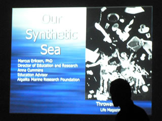 Monday night, researchers Dr. Marcus Ericksen and Anna Cummins from the Algalita Marine Research Foundation brought their presentation to the Marin Humane Society to share with us their findings from several trips out to the North Pacific Gyre, aka the Great Pacific Garbage Patch. To the left is a photo of actual objects removed from the carcasses of dead Laysan albatrosses. How a bird eats a toothbrush, I don’t know. But it truly saddens me.