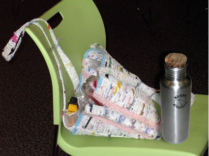 And he is a living testament to his convictions. His bag, knitted from plastic grocery bags, is a reminder of plastic in the environment, while his naturally-corked stainless steel water bottle demonstrates his dedication to reducing his own personal consumption of plastic. I must say, I’ve taken many, many steps to lower my plastic footprint, but seeing that cork in his Klean Kanteen blew me away.