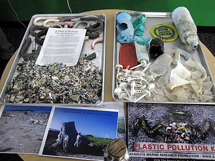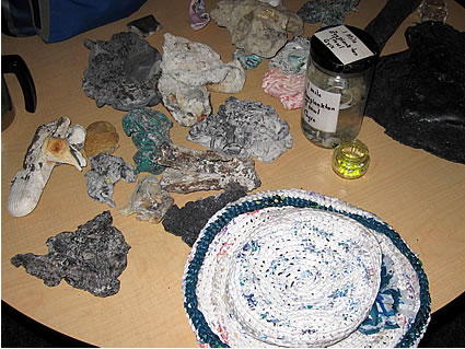 Moore’s presentation included many samples of the types of plastics found in the Pacific Ocean and that wash up daily on the world’s beaches, as well as a hat knitted out of some of that plastic, which he sometimes wears.