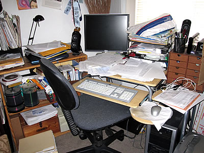 I also have a permanent pencil tied onto my desk with cotton thread. That way I never lose it to the kids, husband, cats etc. (BTW hubby's desk looks even worse than yours does!)
