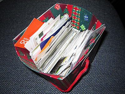 And here’s what ends up happening to the bazillions of business cards I collect. Useful, right? But I don’t want a plastic business card holder. Would love to figure this one out before the BlogHer conference next week, where I’ll inevitably end up with a whole lot more unless I can figure out a better system. (Write contact info in notebook and hand back the card? Seems like it could take too long in a room full of women all passing out cards.)