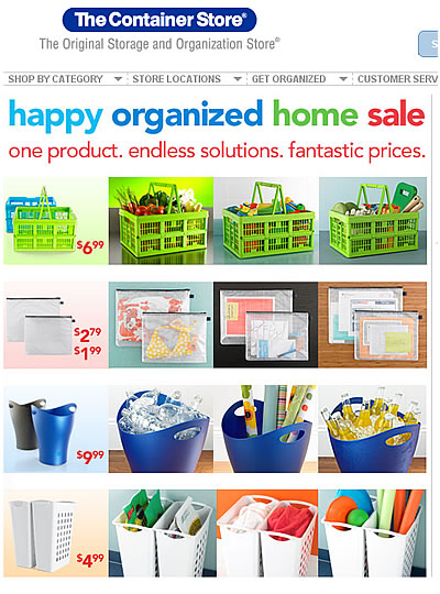 The trouble is, many of the organizing and simplifying ideas I read in magazines at the check out counter involve buying a bunch of new stuff. Plastic bins. Plastic trays. Plastic business card holders. Check out the home page for the Container Store:
