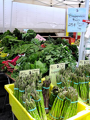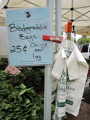 The Berkeley Farmers Market provides corn-based compostable BioBags instead of plastic. In Berkeley, compostable bags are actually picked up curbside and composted. Still, recognizing that corn-based bags are not a perfect substitute, the Berkeley vendors charge .25 per compostable bag in order to encourage customers to bring their own reusable bags.