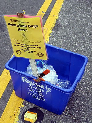 To encourage shoppers to reuse bags instead of taking new ones, Berkeley has always had a used bag bin at the entrance to the market where folks can drop off old bags or take bags if they forget their own.