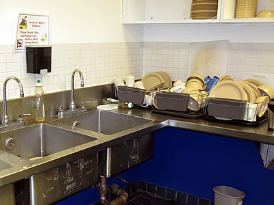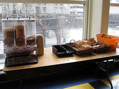 At the hostel, there’s no such thing as individually-wrapped anything! Breakfast comes in bulk containers on durable dishes.