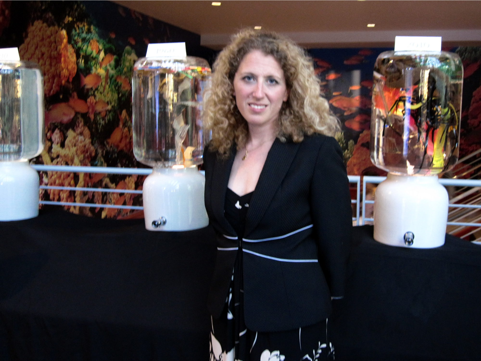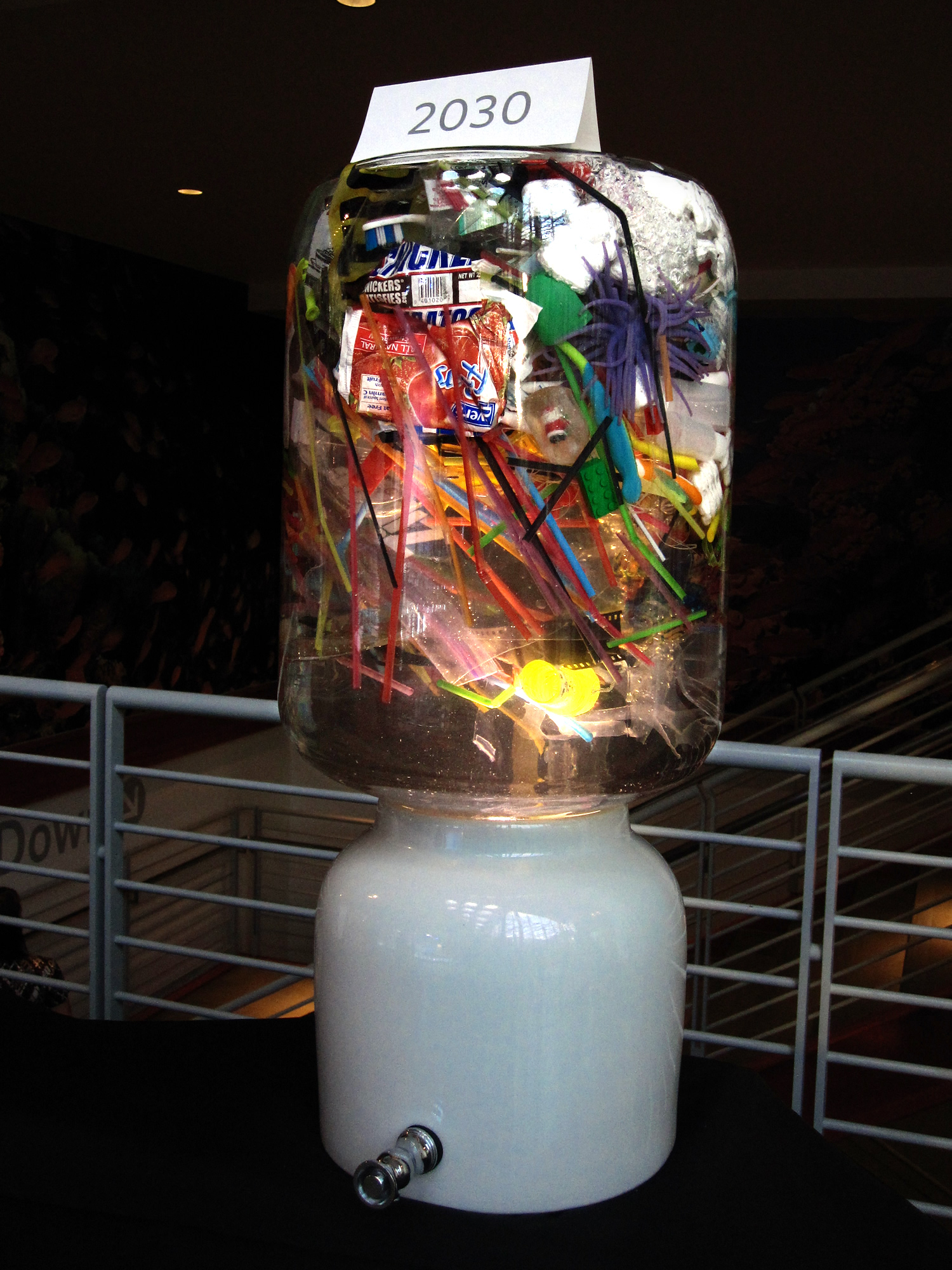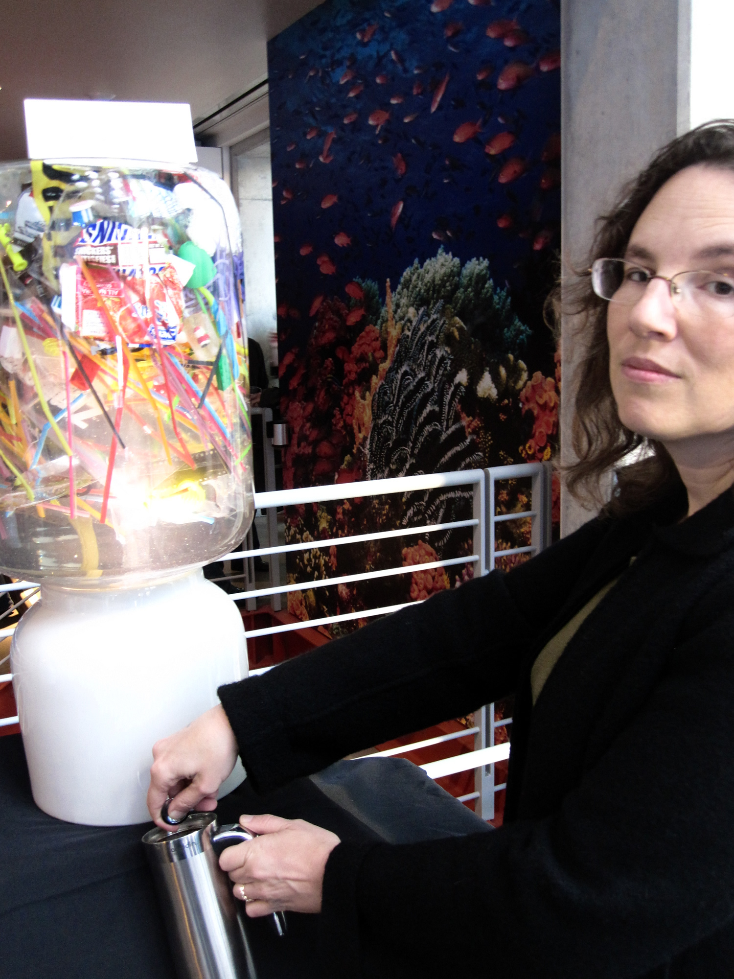 The Plastic Century artists set up an installation at the SF Academy of Sciences last week asking visitors to think about the rise of plastics in the world’s oceans from 1910, the year Jacques Cousteau was born, to 2030, an imaginary time when plastic has completely filled up the ocean. Setting up 4 water coolers representing the years 1910, 1960, 2010, and 2030, they ask if you would dare to drink. The plastic in the coolers is both sad and beautiful, isn’t it?